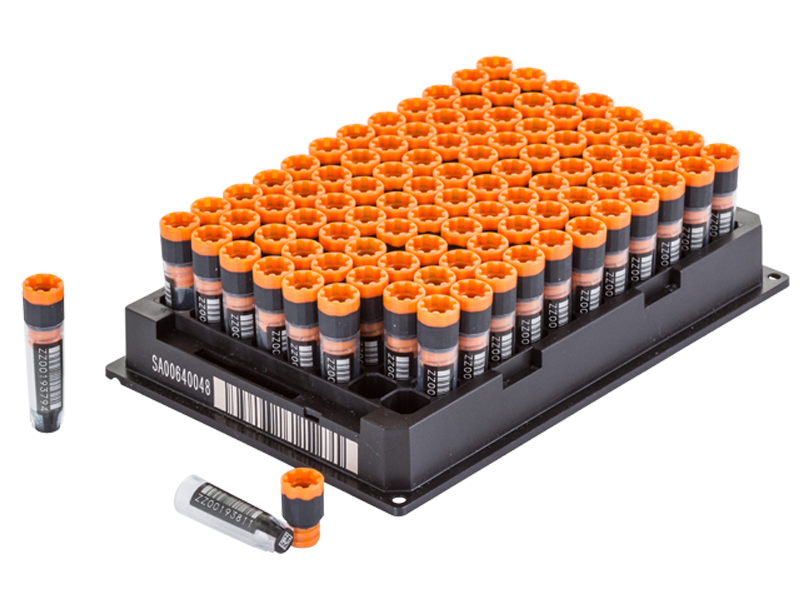 - Permanently laser etched 2D code on base, 1D linear barcode and human readable number on the side, ensuring a permanent link between sample and data