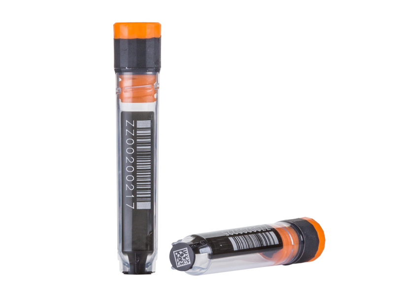 Each tube features a permanent 2D code laser etched in high contrast on the tube base, a permanent 1D linear barcode and human-readable number laser etched in high-contrast on the tube side. All three codes are identical and auditing processes guarantee all three codes match; standard 2D coding option is black on white.