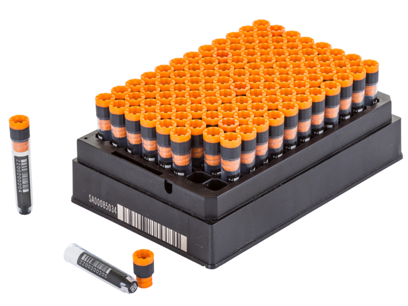 - Permanently laser etched 2D code on base, 1D linear barcode and human readable number on the side, ensuring a permanent link between sample and data