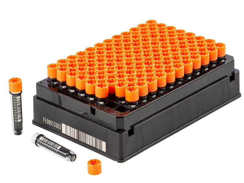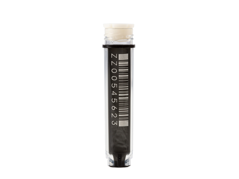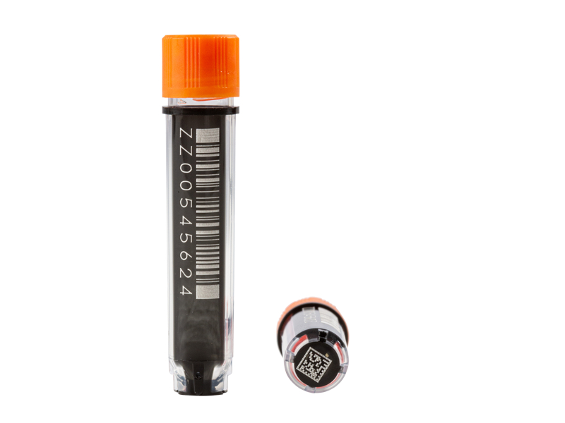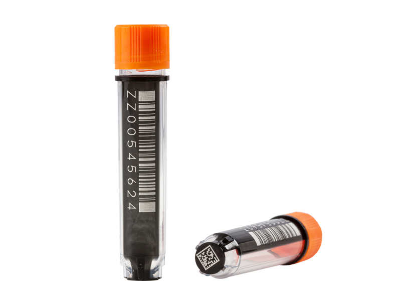 - Permanently laser etched 2D code on base, 1D linear barcode and human readable number on the side, ensuring a permanent link between sample and data
