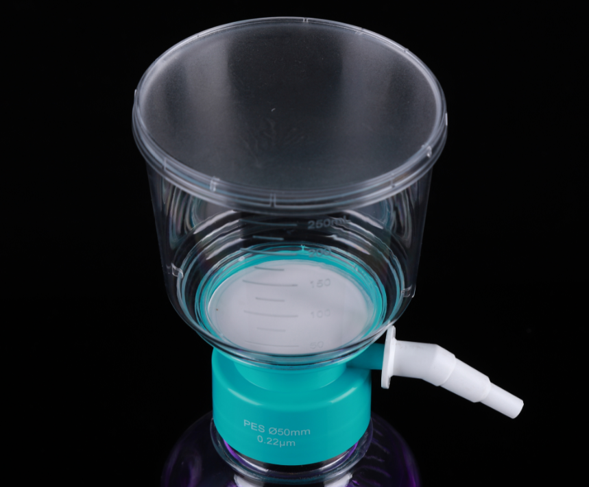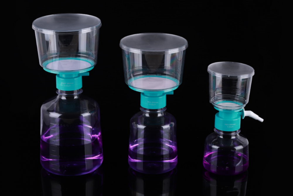 It is mainly used in tissue culture media and biological fluids for separation and purification of large volume samples. The whole set includes membrane diaphragm, a graduated, transparent polystyrene funnel connected to a receiving bottle by a connector. The disposable vacuum filter utilizes a vacuum pump to provide pressure differentials for processing large volumes of tissue culture fluids and other laboratory fluid solutions and the volume of processed samples could be up to several liters. The filtered samples can be stored directly in sterile collection bottles.
