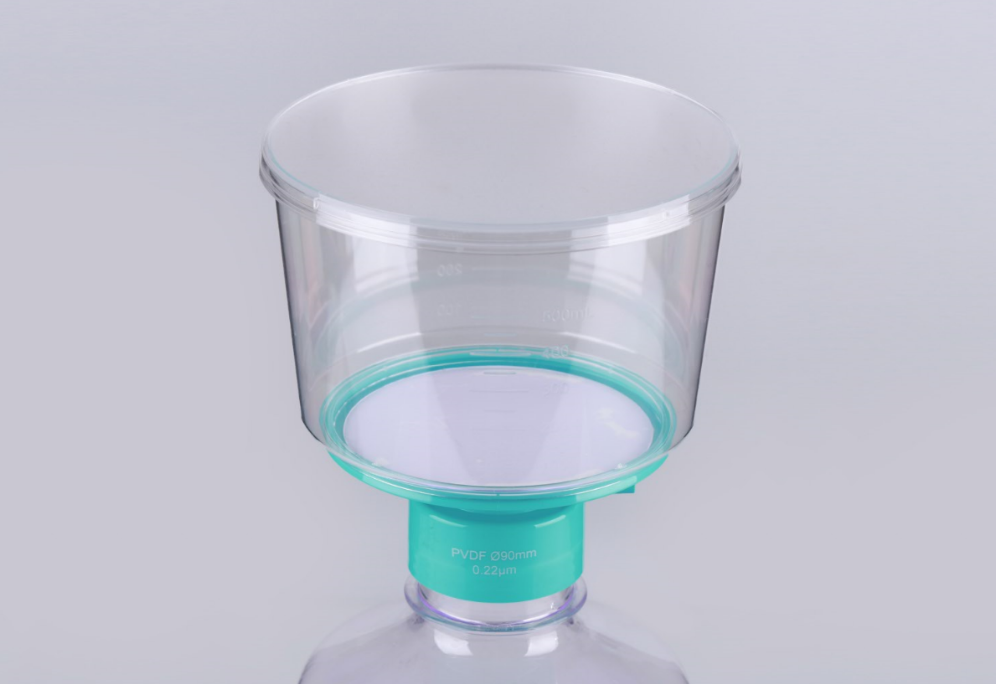 It is mainly used in tissue culture media and biological fluids for separation and purification of large volume samples. The whole set includes membrane diaphragm, a graduated, transparent polystyrene funnel connected to a receiving bottle by a connector. The disposable vacuum filter utilizes a vacuum pump to provide pressure differentials for processing large volumes of tissue culture fluids and other laboratory fluid solutions and the volume of processed samples could be up to several liters. The filtered samples can be stored directly in sterile collection bottles.