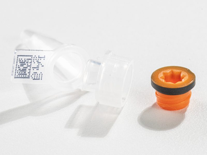 - Tab on side of cap includes a 2D datamatrix code and human readable number