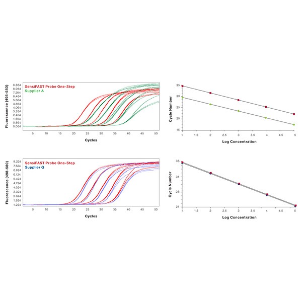 The SensiFAST Probe No-ROX One-Step Kit has been optimized for fast, efficient, unbiased cDNA synthesis and subsequent highly-sensitive, reproducible real-time PCR detection in a single tube. SensiFAST Probe One-Step has been optimized to deliver excellent results in both singleplex and multiplex assays.