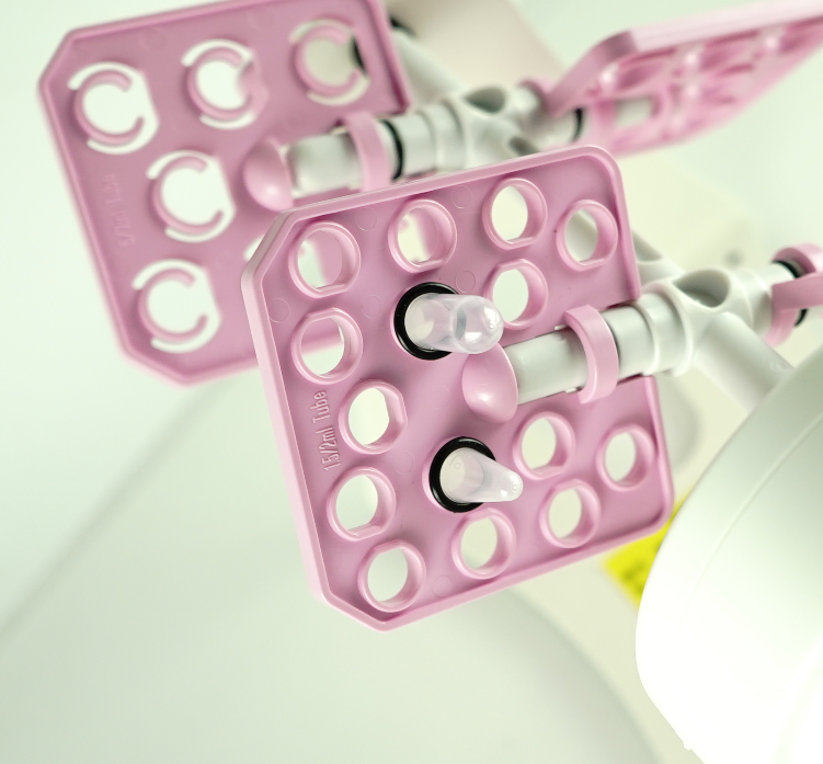 The tube revolver can be used in a variety of laboratory fields such as Molecular Biology, Biochemistry, Clinical, and Histochemistry. The rotisseries are interchangeable so that the unit works with a variety of tube sizes. The four rotisserie paddles can be mixed for a combination of different tubes. Each paddle direction can be independently adjusted from 0-90 degrees.