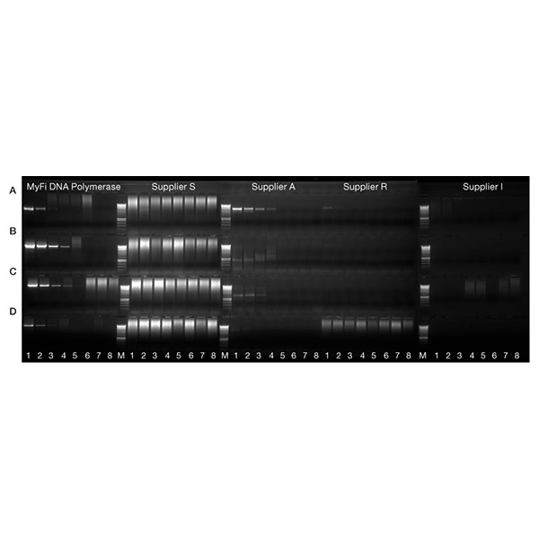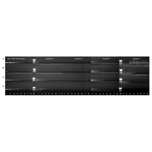 MyFi™ a fost dezvoltat pentru a oferi amplificarea fiabilă a țintelor de până la 10 kb din ținte dificile și complexe. MyFi arată o toleranță îmbunătățită la inhibitorii PCR, permițând astfel detectarea fiabilă din mostre din care ADN-ul este dificil de purificat. În plus, un sistem unic de tampon și un amestec de enzime promovează amplificarea extrem de sensibilă, ideală pentru țintele cu număr redus de copii. Includerea MyTaq HS înseamnă că MyFi generează produse PCR cu extremități 3’-A, făcându-l potrivit pentru clonarea TA. MyFi oferă confortul suplimentar al asamblării reacției la temperatura camerei, pentru a evita amplificarea nespecifică și formarea de primer-dimer.