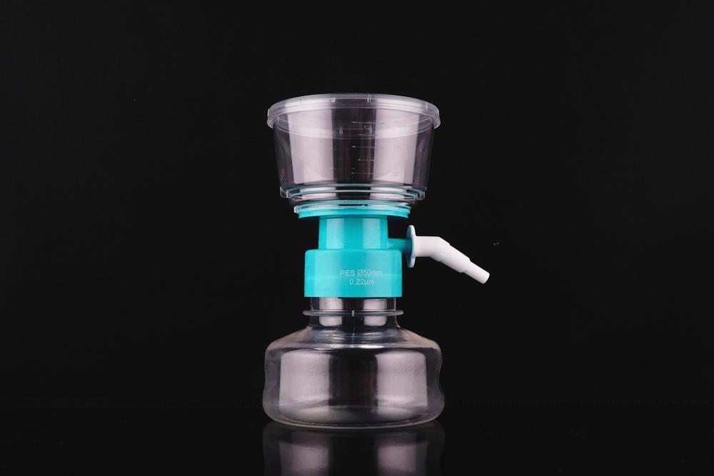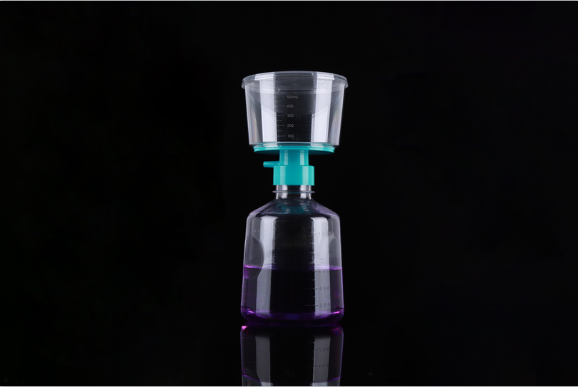 Este utilizat în principal în mediile de cultură tisulară și fluidele biologice pentru separarea și purificarea probelor de volum mare. Setul complet include diafragma de membrană, o pâlnie gradată, transparentă din polistiren, conectată la o sticlă receptoare printr-un conector. Filtrul de vid de unică folosință utilizează o pompă de vid pentru a asigura diferențe de presiune pentru procesarea volumelor mari de fluide de cultură tisulară și a altor soluții fluide de laborator, iar volumul probelor procesate poate fi de până la câțiva litri. Probele filtrate pot fi stocate direct în sticle de colectare sterile.