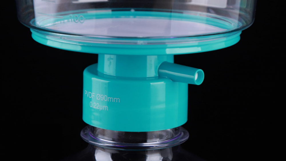 Este utilizat în principal în mediile de cultură tisulară și fluidele biologice pentru separarea și purificarea probelor de volum mare. Setul complet include diafragma membranei, o pâlnie transparentă din polistiren gradată conectată la o sticlă de colectare printr-un conector. Filtrul de vid de unică folosință utilizează o pompă de vid pentru a oferi diferențe de presiune pentru procesarea volumelor mari de fluide de cultură tisulară și alte soluții de laborator, iar volumul probelor procesate poate ajunge până la câțiva litri. Probele filtrate pot fi stocate direct în sticle de colectare sterile.